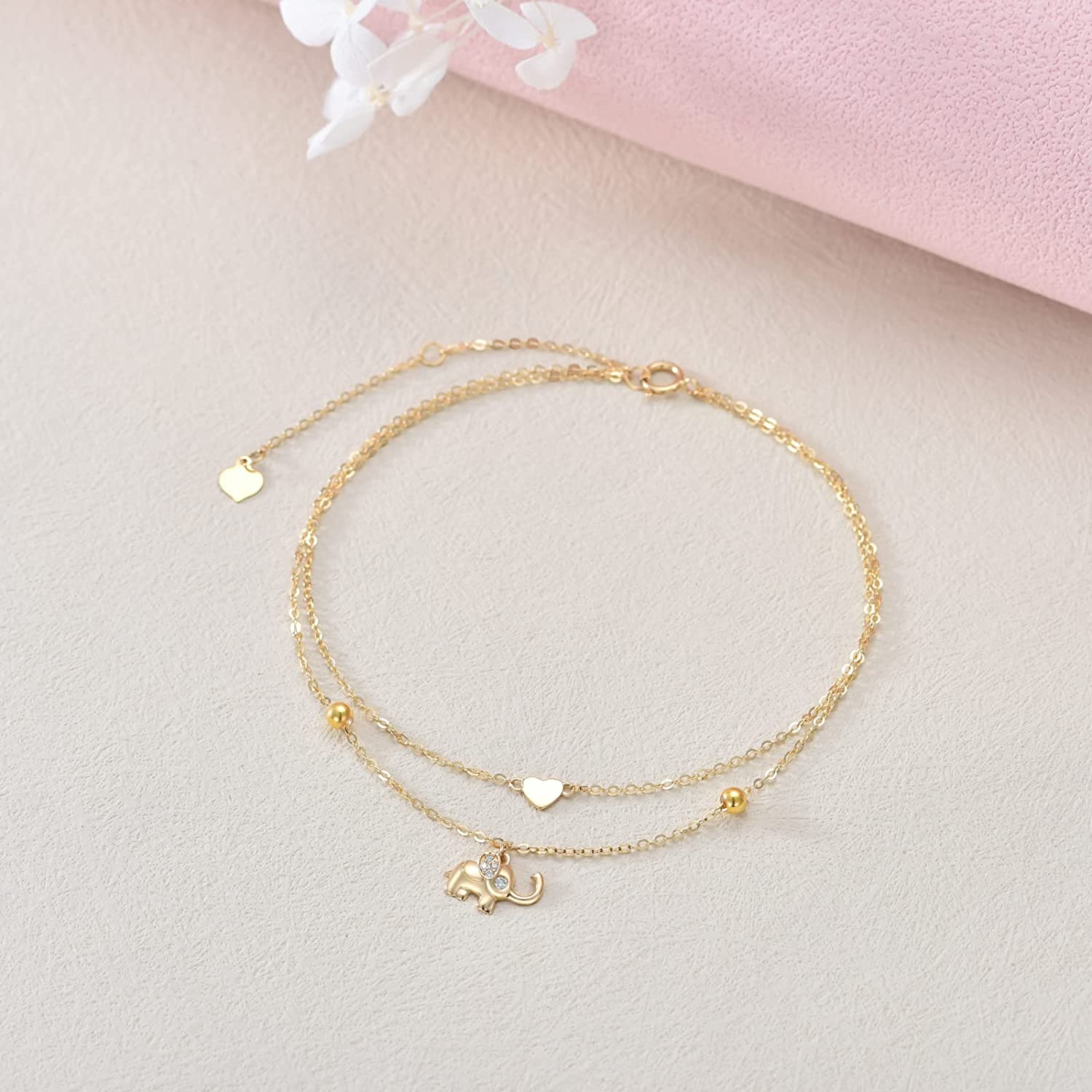 14K Pure Gold Lucky Elephant Anklet for Women, Real Gold Layered Heart Anklet Bracelet Fine Jewelry Anniversary Birthday Mother's Day Gift for Her, Wife, Mom, Girlfriend, 8"+2", Metal, Square Crystal